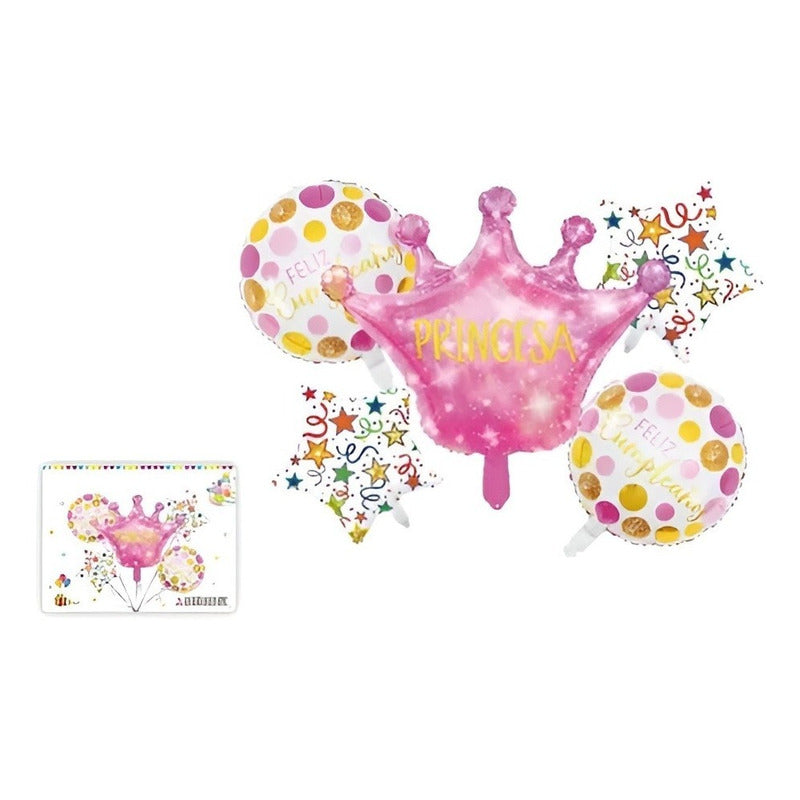 X5 Set Feliz Cumpleaños Princesa ° Medidas de inflado: Globo Corona 76 cm x 75cm Globos Estrellas 45cm Globos Redondo 45 cm ° No incluye varillas. ° Pueden Ser Inflado con Aire o Helio. ° Fácil de montar ° Ideal para cumpleaños, todo tipo de celebraciones con tematica. Tu compra incluye: 1 Globo de Corona 2 Globos Estrellas 2 Globos Redondos VITRINEON CL