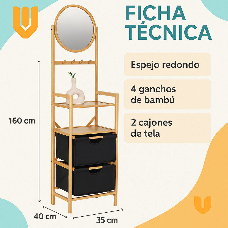 Organizador Bambú Ropa Espejo Doble Canasto Multifuncional